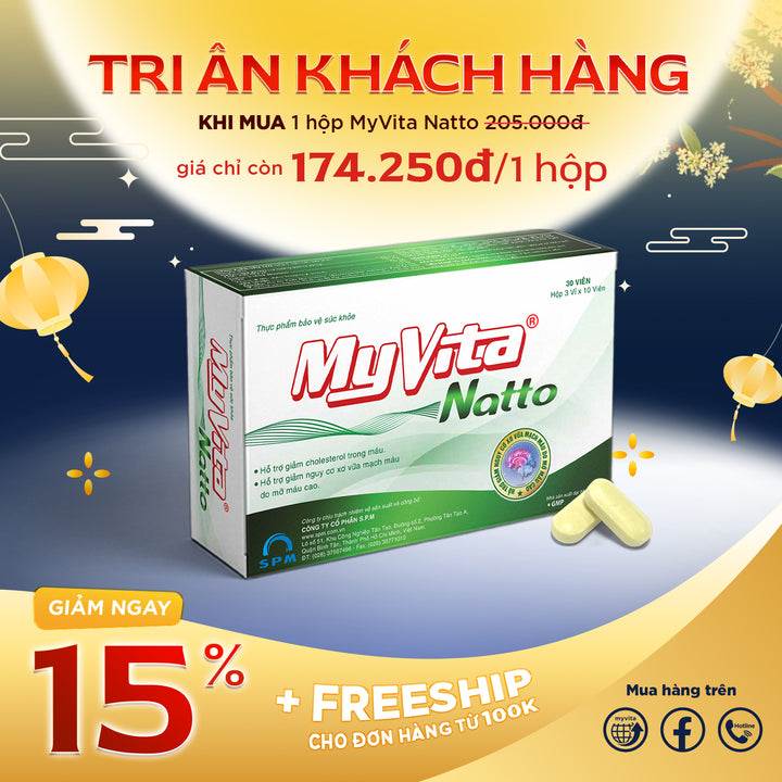 MyVita Natto là sản phẩm kết hợp giữa Nattokinase (chiết xuất từ đậu nành lên men), cùng vitamin C, E và chiết xuất diếp cá giúp hỗ trợ giảm cholesterol trong máu hiệu quả.